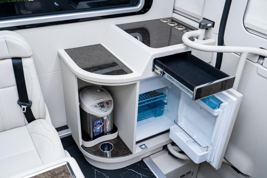 4 张中心座椅分设前后两排,粥少僧多达 95cm,中心通道宽 40cm,12 人满员时后排乘客进出无短促;每张座椅扶手均集成 60W 无线快充,旗舰座椅额定装备双温控杯架(恒温 5℃/60℃),细节处表现分级礼遇,商务招待更显用心。