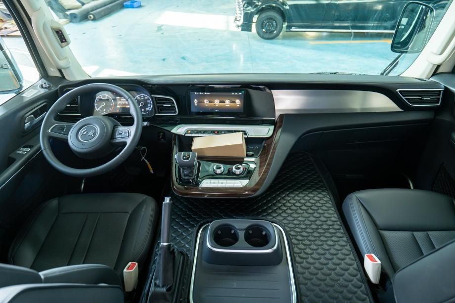 中控台、门板扶手均嵌入埃尔法款式桃木装修,选用进口胡桃木基材,经 3 层哑光清漆处理,木纹温润深邃,复原高端 MPV 的奢华质感。装修边际做圆弧打磨,防止磕碰划伤,与黑色岩板地板、象牙白内饰构成 “木 + 白 + 黑” 的调和调配,逐渐提高座舱高端风格,让 12 人商务招待更显显贵。