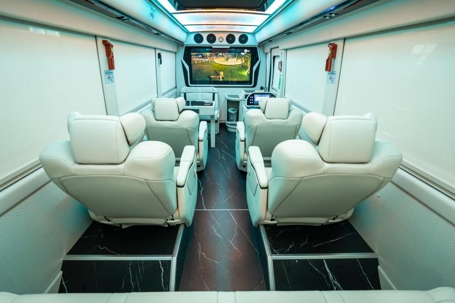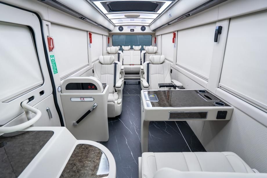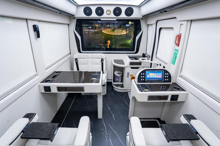 车身选用无立柱规划,调配广大侧窗,白日天然光线足够,座舱更显宽阔;原车装备电动遮阳窗布,一键调理透光率,防止强光直射,维护乘客隐私的一同,不损坏象牙白内饰的全体感。车顶搭载空客同款顶灯,支撑 “商务白、温馨暖、静寂蓝” 三色切换 —— 商务白合适评论计划,温馨暖适配茶歇沟通,静寂蓝助远程歇息,分区调光互不搅扰。