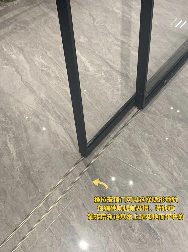 建议:推拉玻璃门可以再一次进行选择隐形地轨,在铺砖前提前开槽、装轨道,铺砖后轨道绝大多数都是和地面平齐的,隐形又好看。