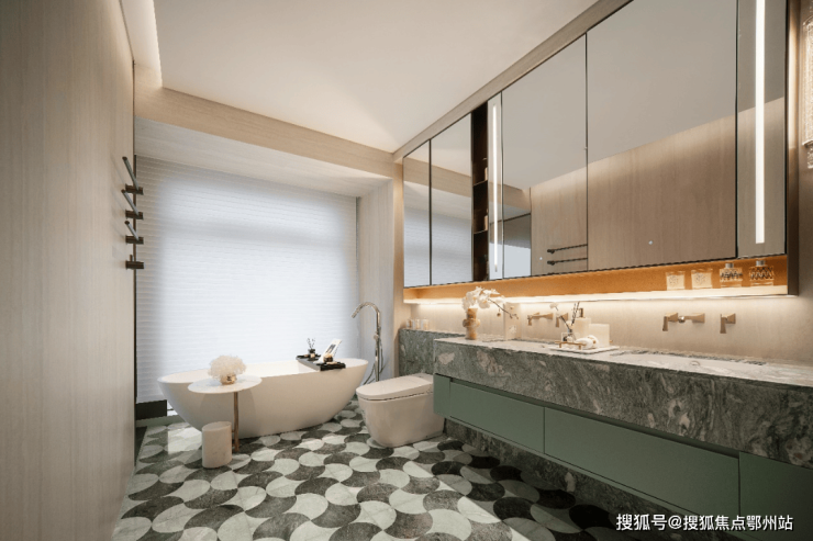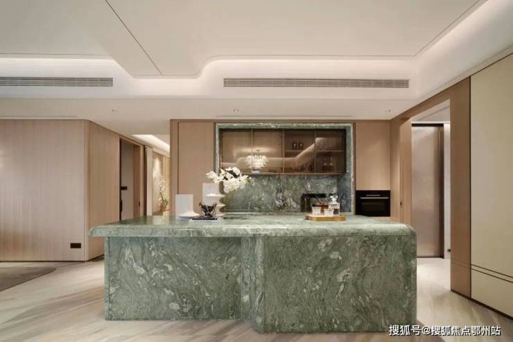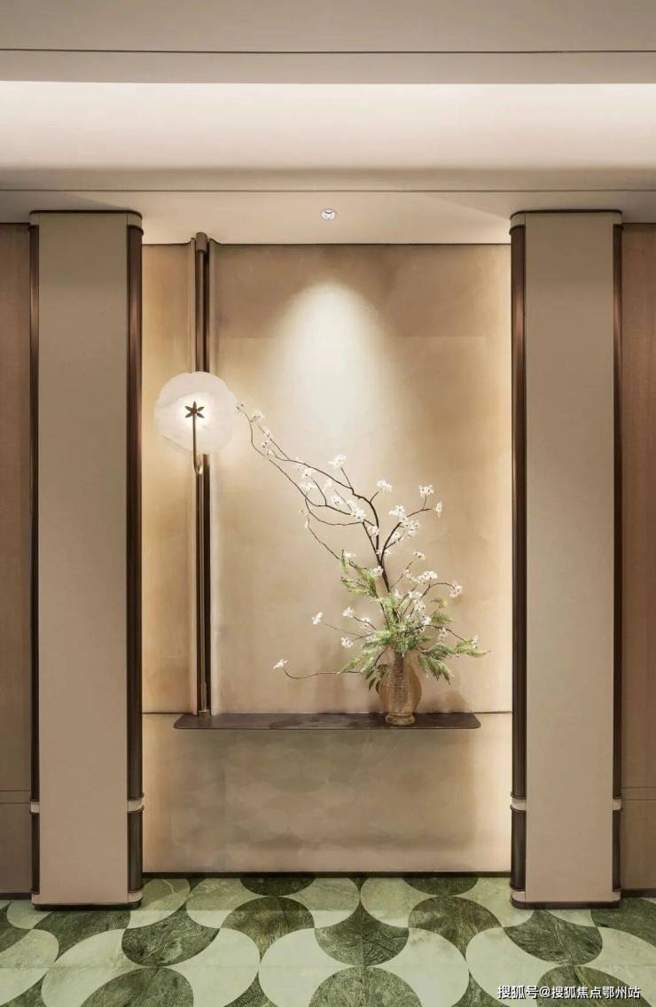 主卧的锤纹门把手、地板花瓣拼、镂花的空调出风口每一个都是国际级的工艺。相同,精装的用材也很讲究,从电梯厅到室内各种奢材在这里齐聚,瑞士翡翠、白雪公主、蒂芙尼绿、巴黎金等奢石,还有仿锤纹夹丝玻璃、仿古锈镜、隐木这些稀有用材增加艺术质感。